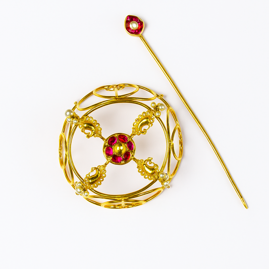 Gold Plated Hair Bun & Stick with Red Kundan & Pearls